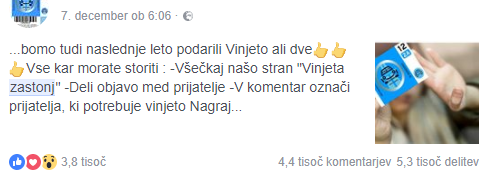 Prva izmed njih je ponudba oziroma deljenje zastonj iPhonov, Samsungov Galaxy, v zameno za všeček in deljenje sporočila, nato pa »nagrajenci« prejmejo obvestilo z navodilom »Pošlji SMS sporočilo “psc kupim 50” na številko 6888 in nam sporoči kodo, ki jo boš dobil v povratnem sporočilu«. Namesto nagrade pa »prejemniki« pričnejo postopek za nakup predplačniške kartice Pay Safe Card v vrednosti 50 evrov. Po sporočeni kodi nakupa, ostanejo zablokirani (da tudi ne opozorijo ostalih) ter ostanejo brez nagrade in 50 evrov.
