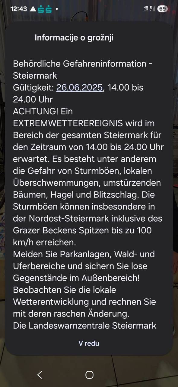 Ljudje na območju avstrijske Štajerske so danes, 26. junija 2025, prejeli uradno opozorilo o nevarnosti zaradi napovedanega ekstremnega vremenskega dogodka.