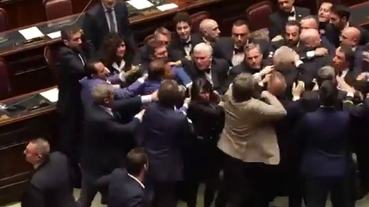 Seja je bila kaotična že od začetka. Opozicijski poslanci so razpravo prekinili z mahanjem z zastavami, prepevanjem himne in pesmi Bella Ciao.
