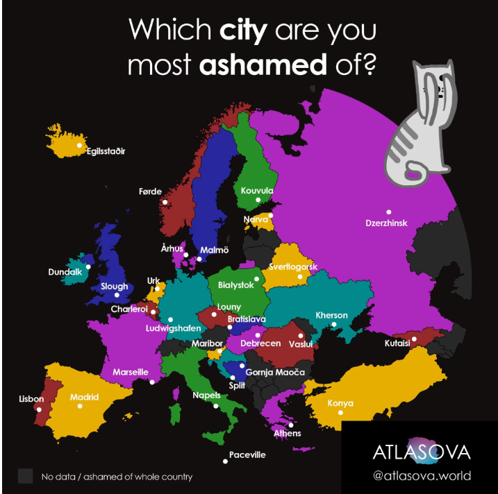 Zemljevid z naslovom Which City Is Each European Country Most Ashamed Of, v kateri avtor na humoren način predstavi, katerega mesta se katera evropska država najbolj sramuje, je postal pravi hit.