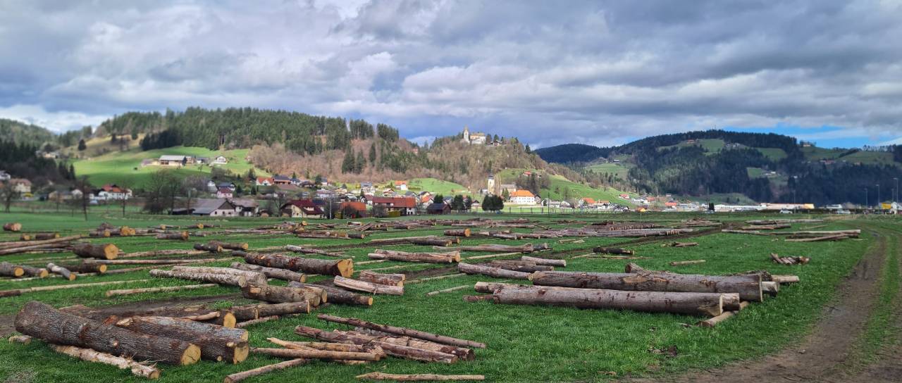 Sredi polja, na obrobju Slovenj Gradca, ležijo številni hlodi, ki še čakajo na lastnike, da pridejo po njih. Večina te hlodovine je sicer že bila prodana na uvodni 18. licitaciji, ki se je odvila 27. februarja letos.