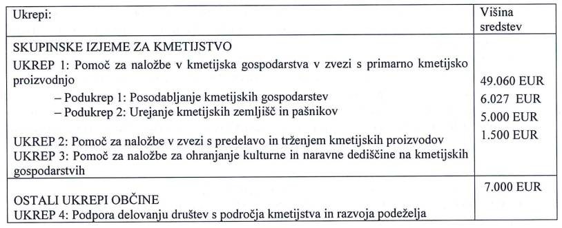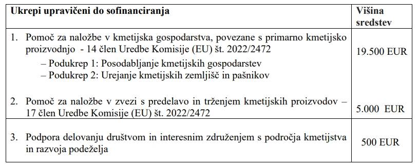 Gre za tri ukrepe, ki so zelo podobno določeni, kot v razpisu za Občino Ormož, in sicer pomoč za naložbe v kmetijska gospodarstva, povezane s primarno kmetijsko proizvodnjo, pomoč za naložbe v zvezi s predelavo in trženjem kmetijskih proizvodov in podpora delovanju društvom in interesnim združenjem s področja kmetijstva in razvoja podeželja