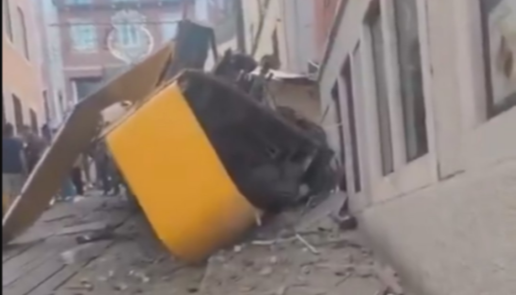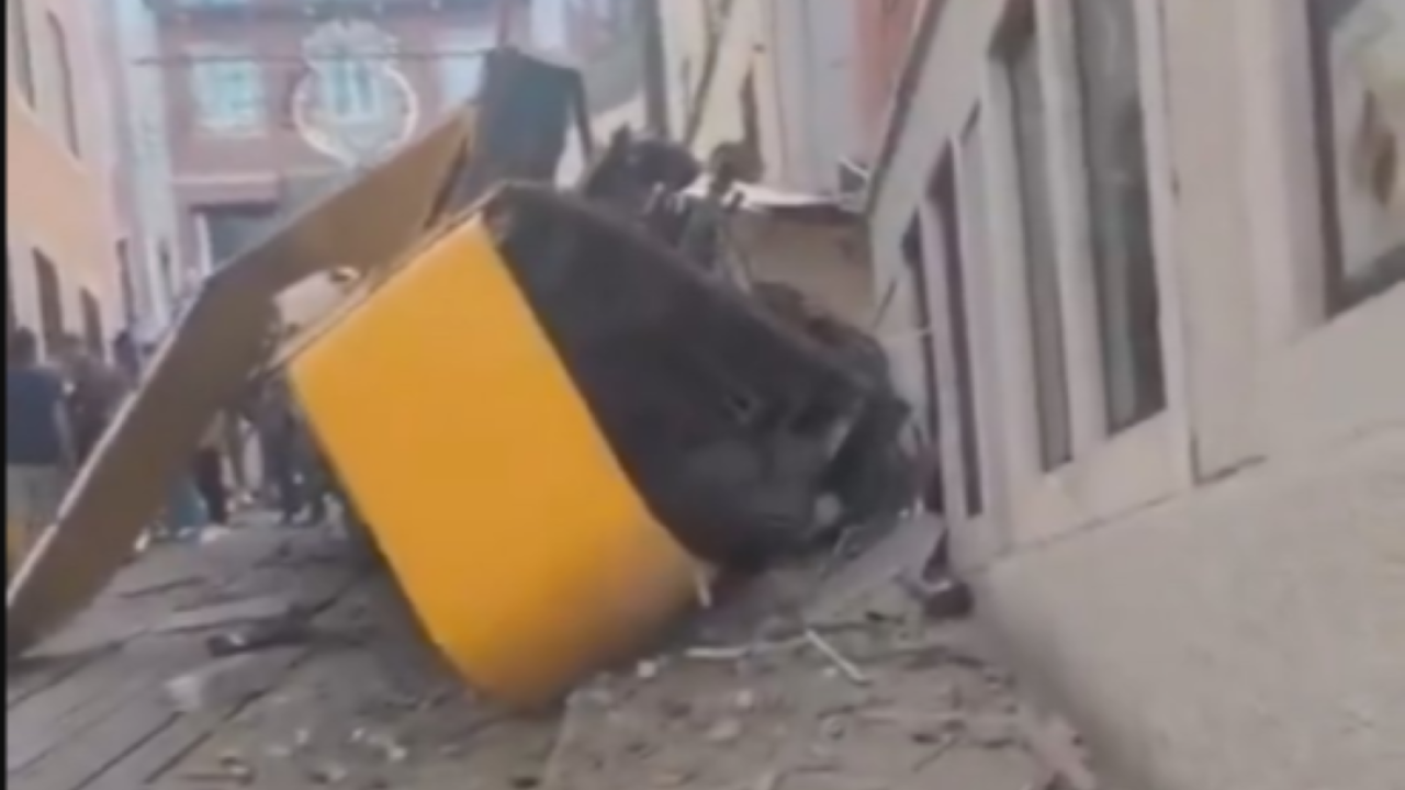 Posnetki z območja nesreče prikazujejo uničeno rumeno vzpenjačo, podobno tramvaju, ki je vozila potnike po strmem klancu portugalske prestolnice. Ostala je v položaju, ko je iztirila in se zaletela v stavbo.
