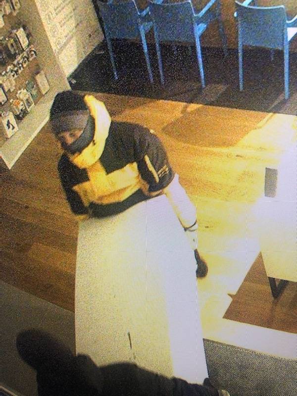• Druga oseba je imela sivo kapo, bundo s kapuco črne barve z belim znakom v predelu trebuha, spodnji del trenerke, črne barve, z napisom bele barve na zgornjem delu v predelu stegna, obut v črne športne copati z belimi podplati, nosil je črne rokavice in modro ali vijolično prevleko preko ust in nosu.