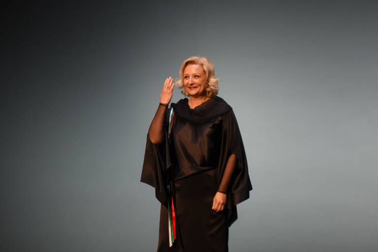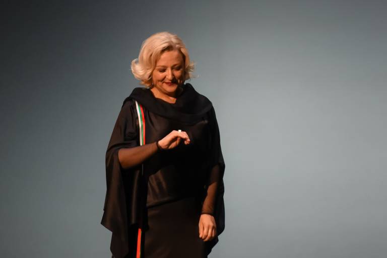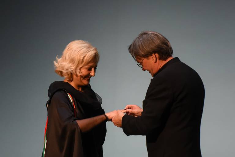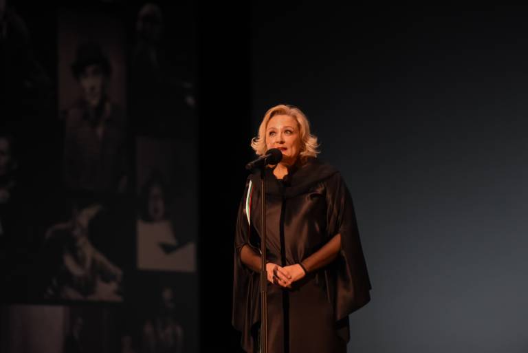 Igralki je prstan nadel lanski dobitnik prstana Branko Šturbej, sama pa je v nagovoru občinstvo pozvala k minuti molka »za vse nedolžne žrtve nesmiselnih vojn«.