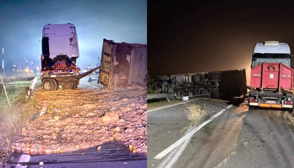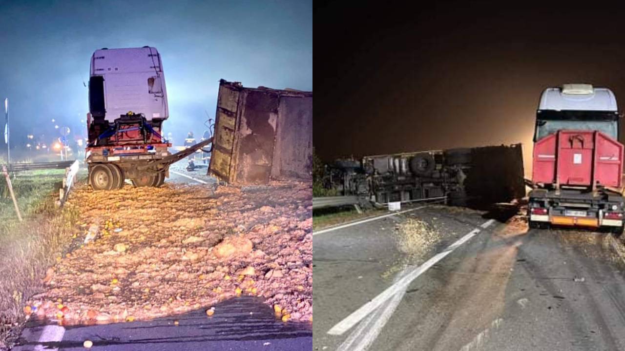 Voznik osebnega avtomobila je zaradi prevelike hitrosti trčil v tovorno vozilo. Pri tem se je tovorno vozilo prevrnilo na bok, iz njega pa se je na cesto razsulo deset ton bioloških odpadkov.