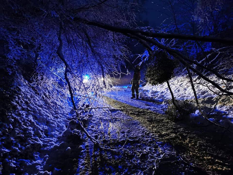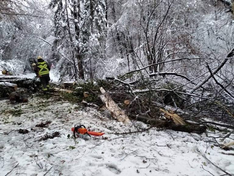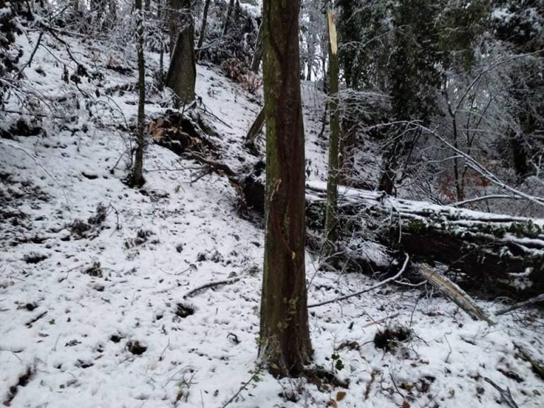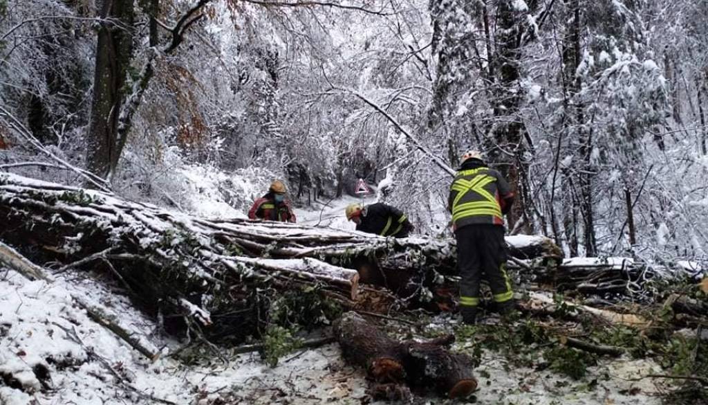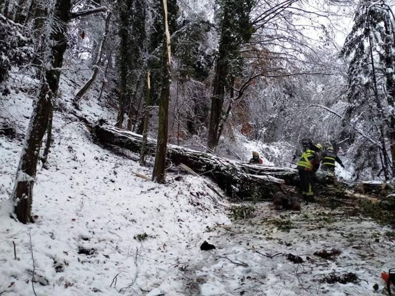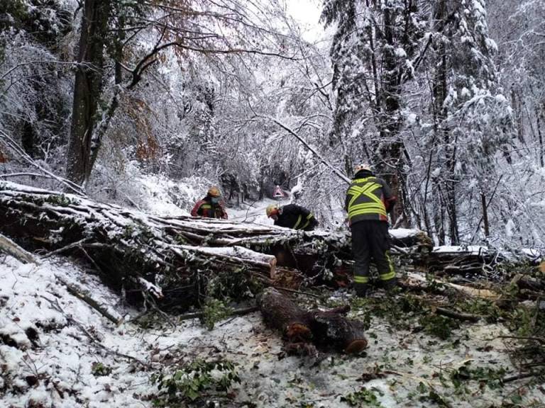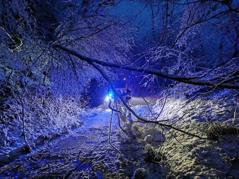 SNEGOLOM: Sneg drevo podrl na vozilo, težave v prometu