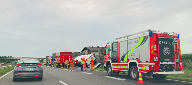 Kot poroča Uprava Republike Slovenije za zaščito in reševanje, se je na avtocesti Ljubljana - Maribor, pred priključkom Fram, se je zjutraj, ob 7.01, tovorno vozilo s priklopnikom prevrnilo na bok.
