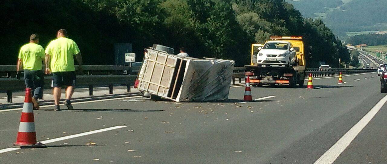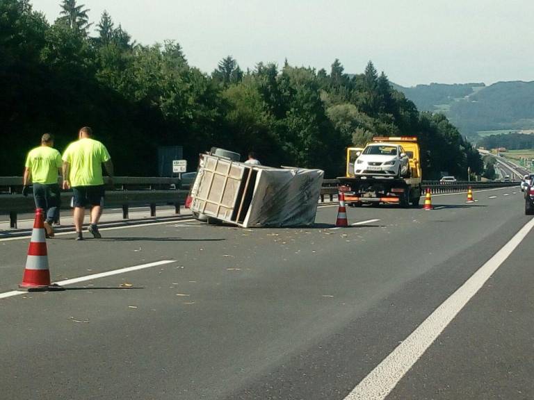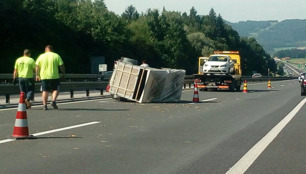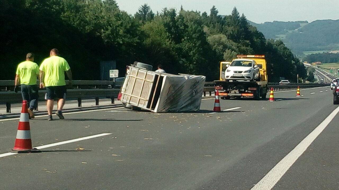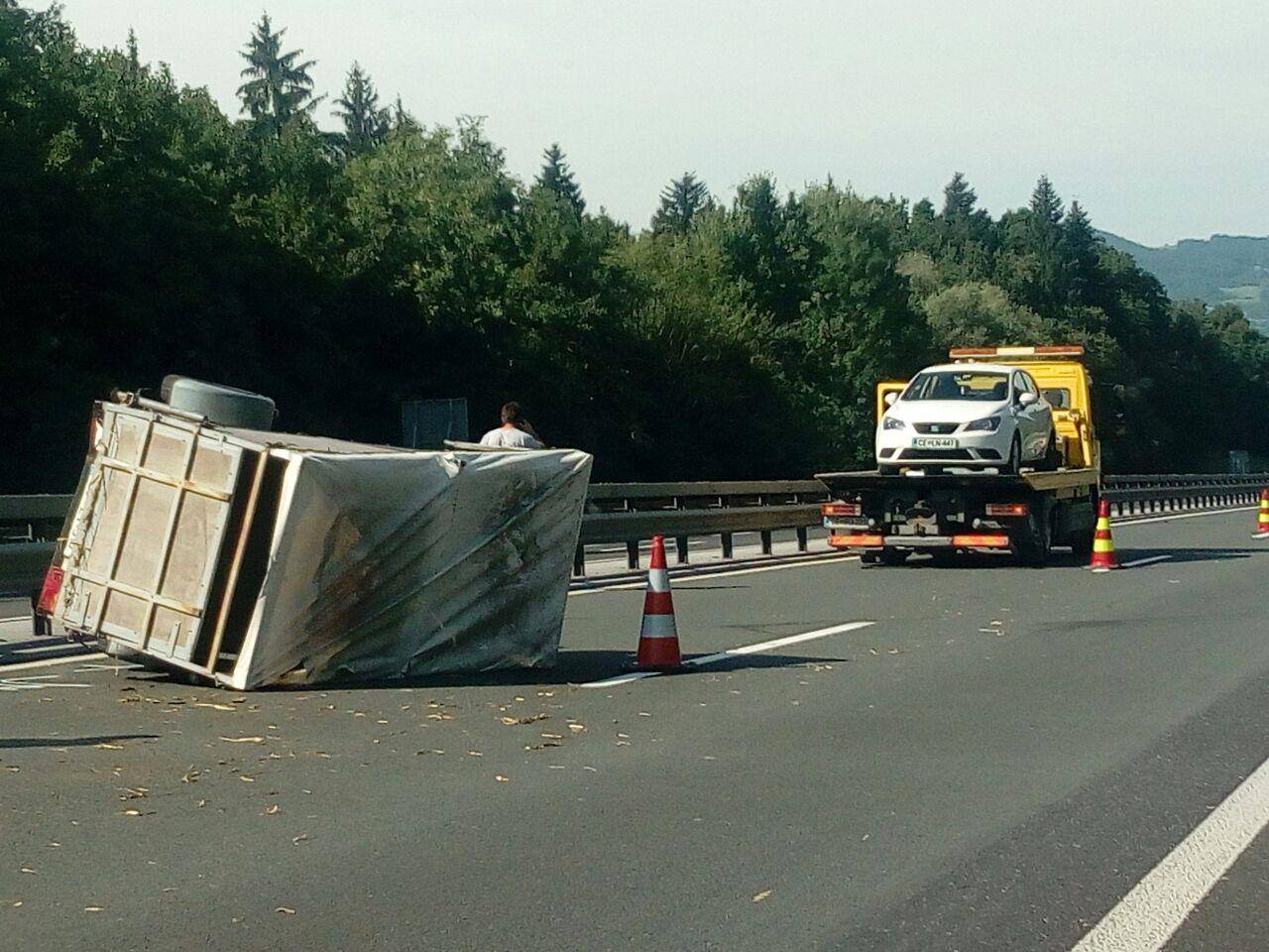 Kot so sporočili iz Uprave RS za zaščito in reševanje, sta na viaduktu Peloge na AC v smeri Slovenska Bitrica - Tepanje, občina Slovenska Bistrica trčili osebni vozili. Eno od teh je imelo priklopljeno prikolico za prevoz živine, na kateri je bilo 10 prašičev, ki se je prevrnila. Pri tem je ena od živali poginila. Posredovali so gasilci iz PGD Slovenska Bistrica. Poškodovanih oseb ni bilo.