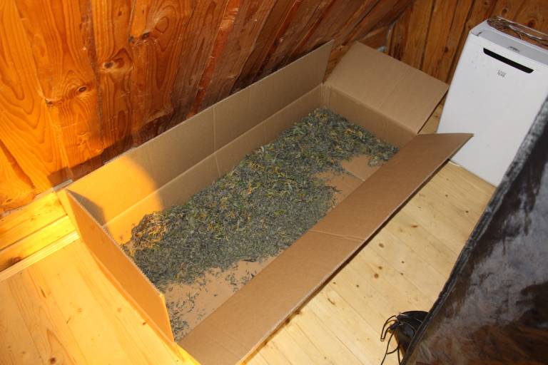 Zasegli so pripomočke za gojenje prepovedane droge, približno 10 gramov posušenih rastlinskih delcev, za katere se sumi, da gre za prepovedano drogo konopljo in PVC brizgalko z neznano tekočino, za katero se sumi da gre za smolo konoplje.