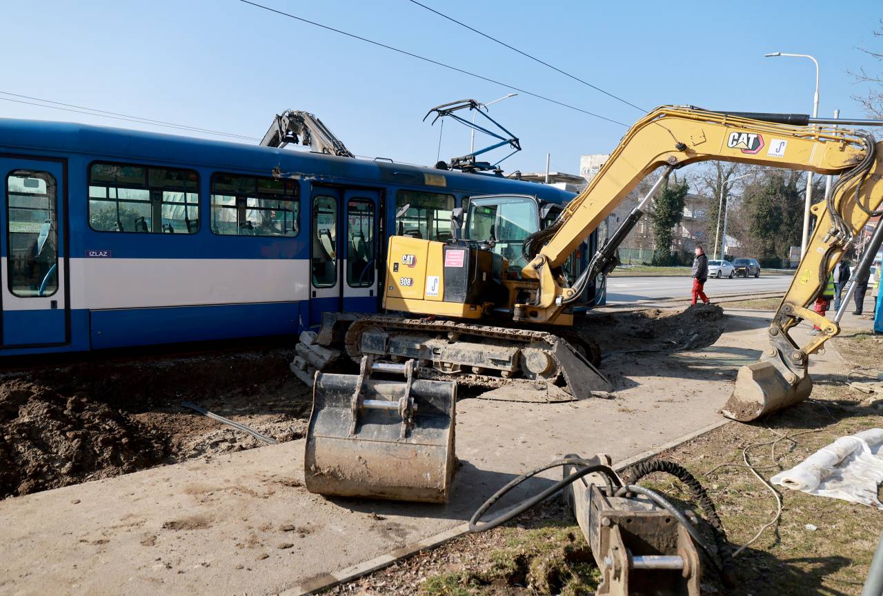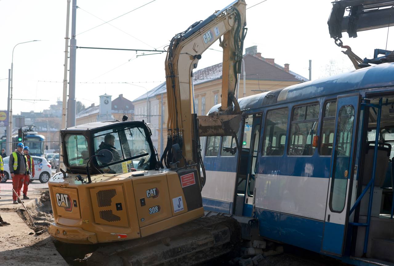 Bager je zadel tramvaj, ki je se je nato nagnil proti cestišču.