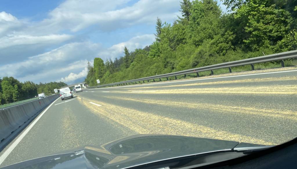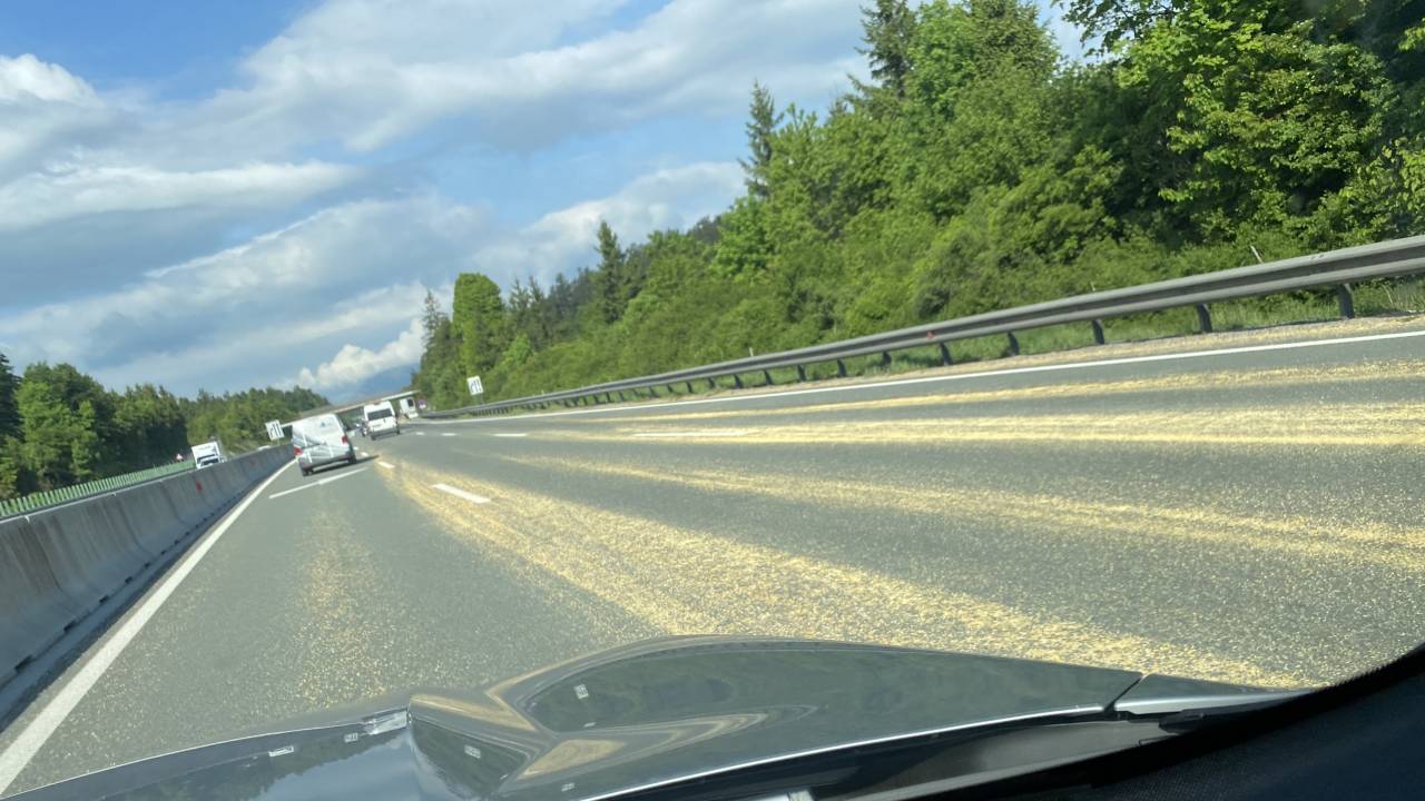 Na primorski avtocesti med Uncem in Ravbarkomando v smeri proti Kopru je po vozišču stresena koruza.