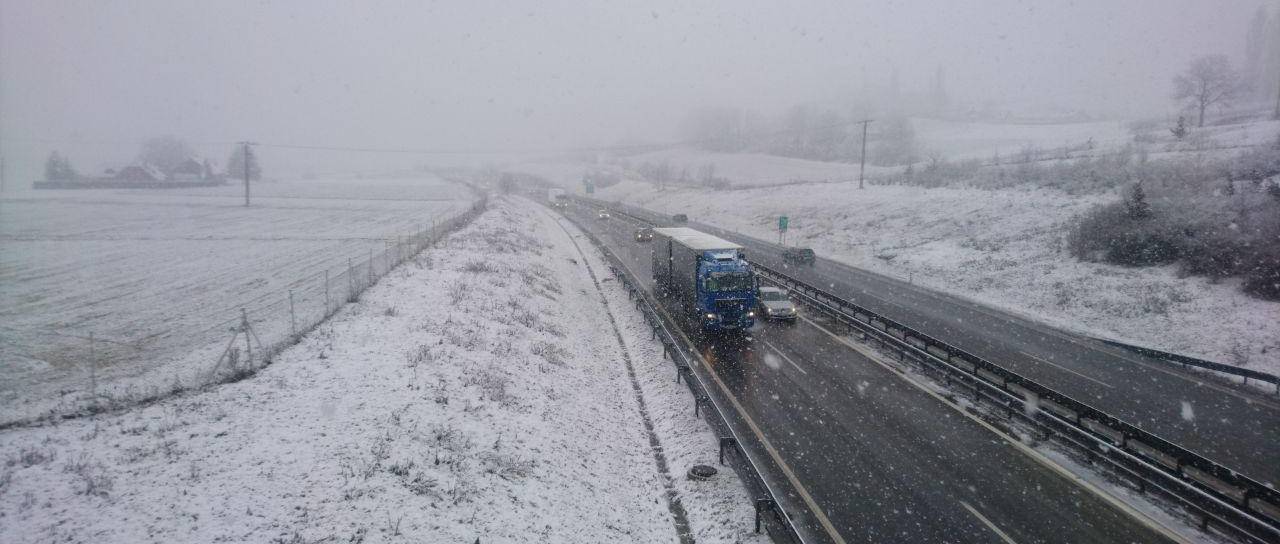 Večji del države je zajelo možno sneženje, sneg pa se ponekod, tudi na štajerski in podravski avtocesti, že oprijema cestišč. Možje v modrem ob tem voznike opozarjajo, naj vožnjo prilagodijo razmeram na cestah.