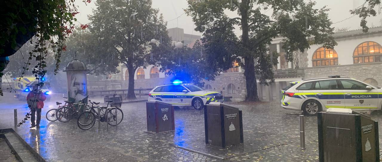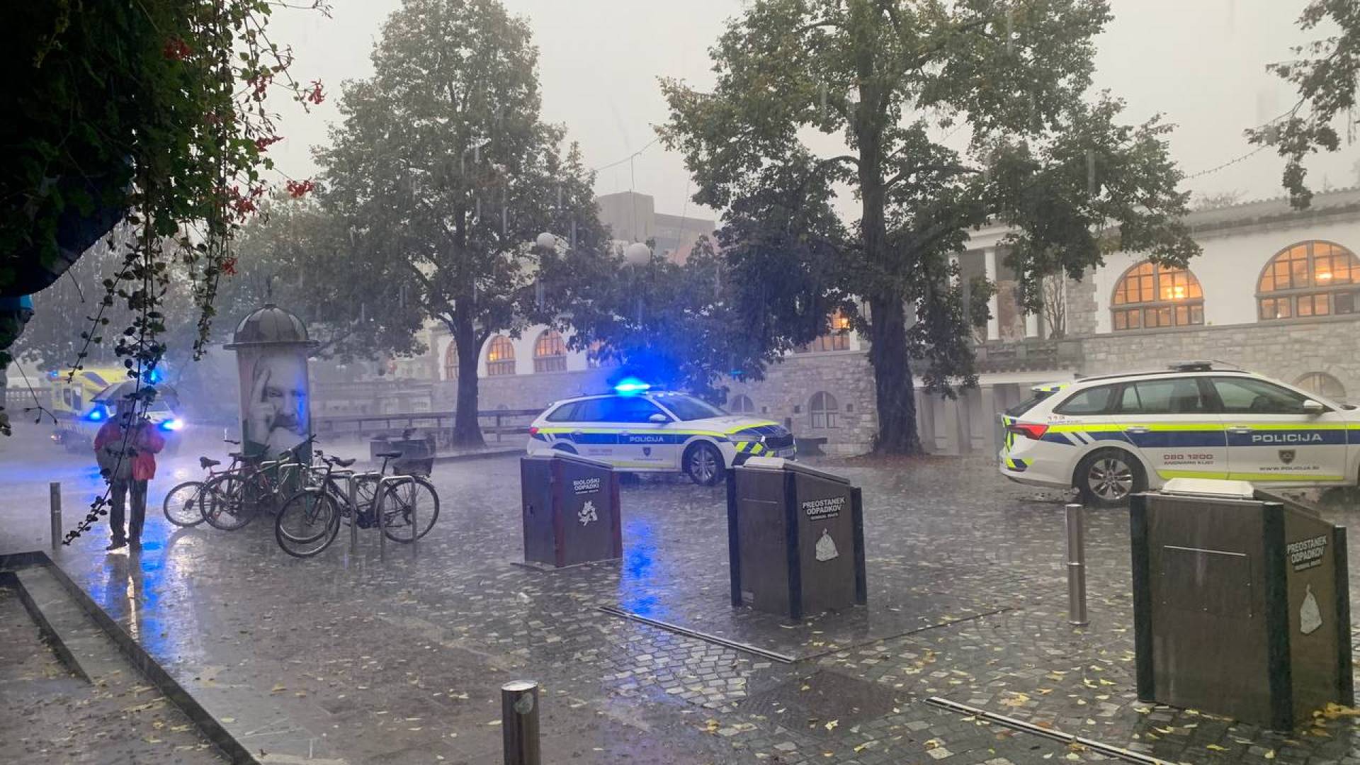 Nekaj po 10. uri dopoldne smo na Petkovškovem nabrežju v središču Ljubljane opazili modre pobliske policijskih luči. V ozadju se je gnetlo tudi vozilo gasilcev, ki se je odpeljalo ravno, ko je sivina neba iz sebe iztisnila silovit naliv.