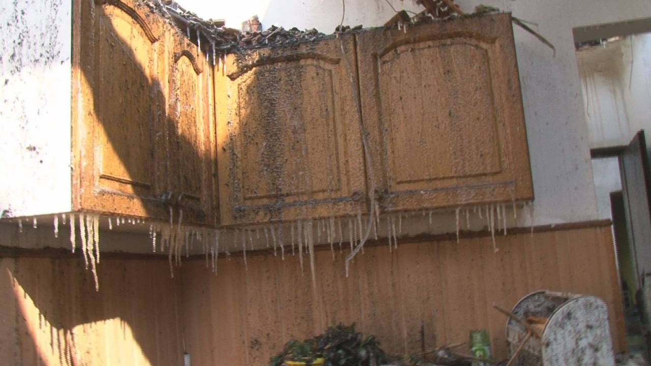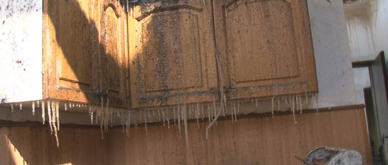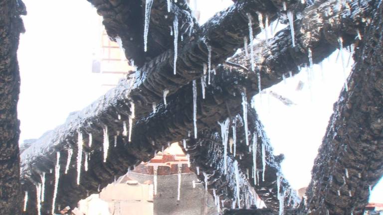 Na lesenih tramovih, kjer je ponoči divjal požar, so danes ledene sveče. Uničenih in zdaj že v ledenem oklepu je sedem stanovanj. Brez strehe nad glavo je ostalo dvanajst ljudi. Zakaj je zagorelo še vedo ne vedo.