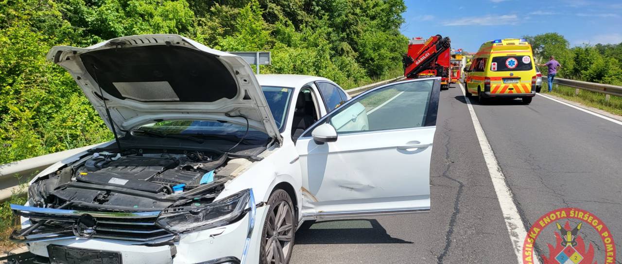 25-letnik je zaradi neprilagojene hitrosti od zadaj trčil v traktor, zaradi česar ga je odbilo v vozilo 46-letnega voznika na nasprotnem pasu. 25-letnik je pri tem utrpel hude poškodbe.