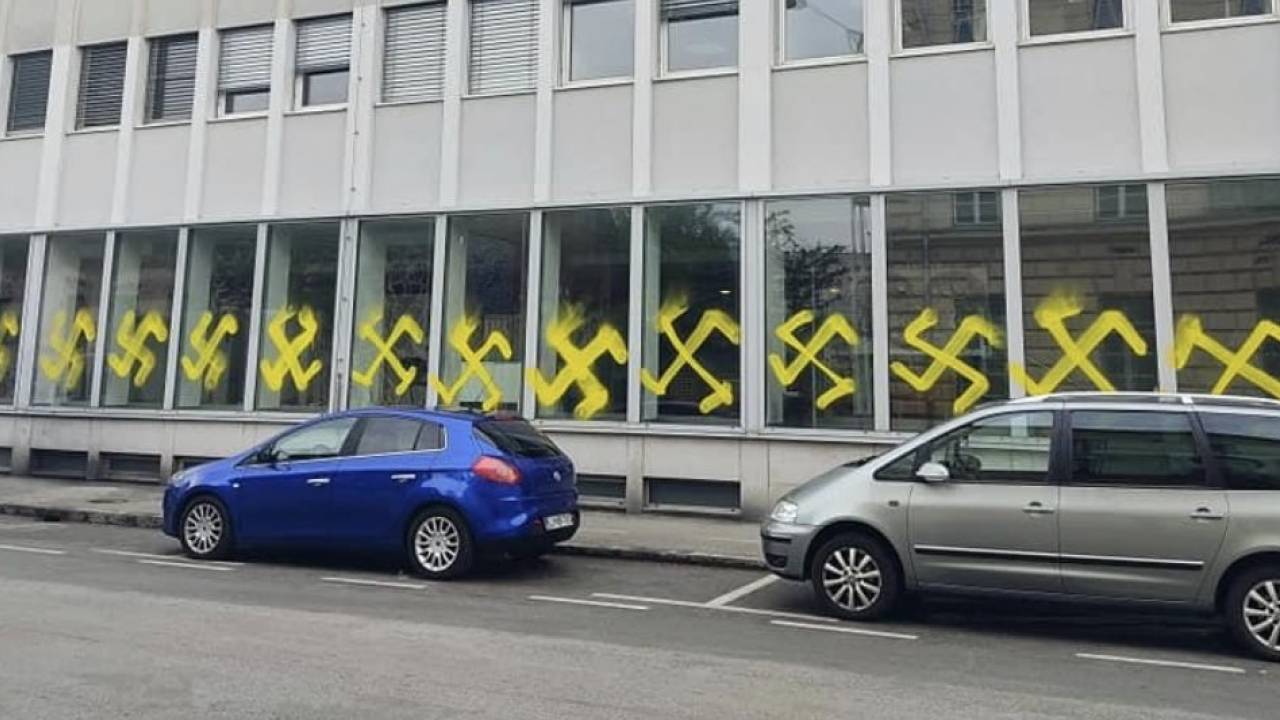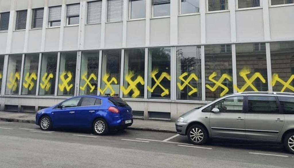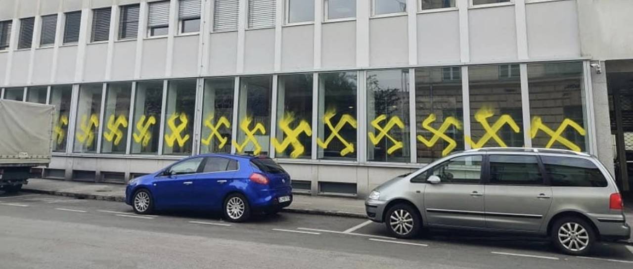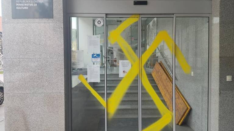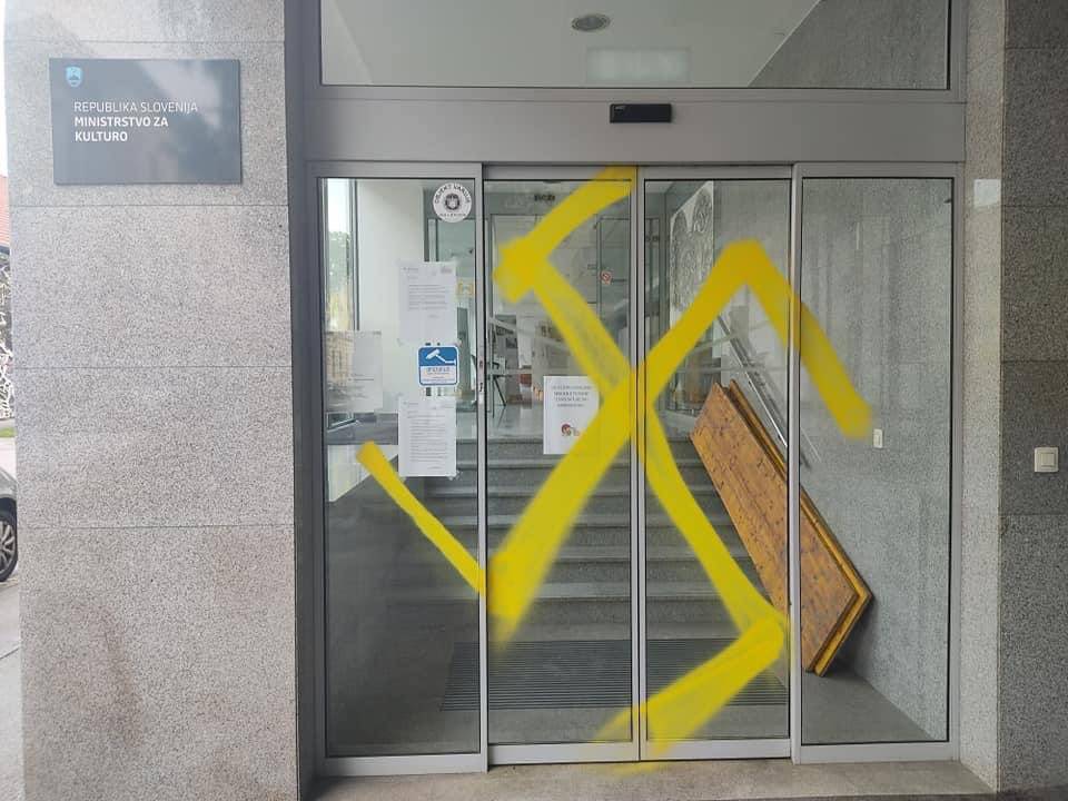 Slovenska političarka Jelka Godec iz vrst SDS je na Twitterju objavila slike zgradbe ministrstva za kulturo, ki so ga neznanci pobarvali z rumenimi nacističnimi znaki.