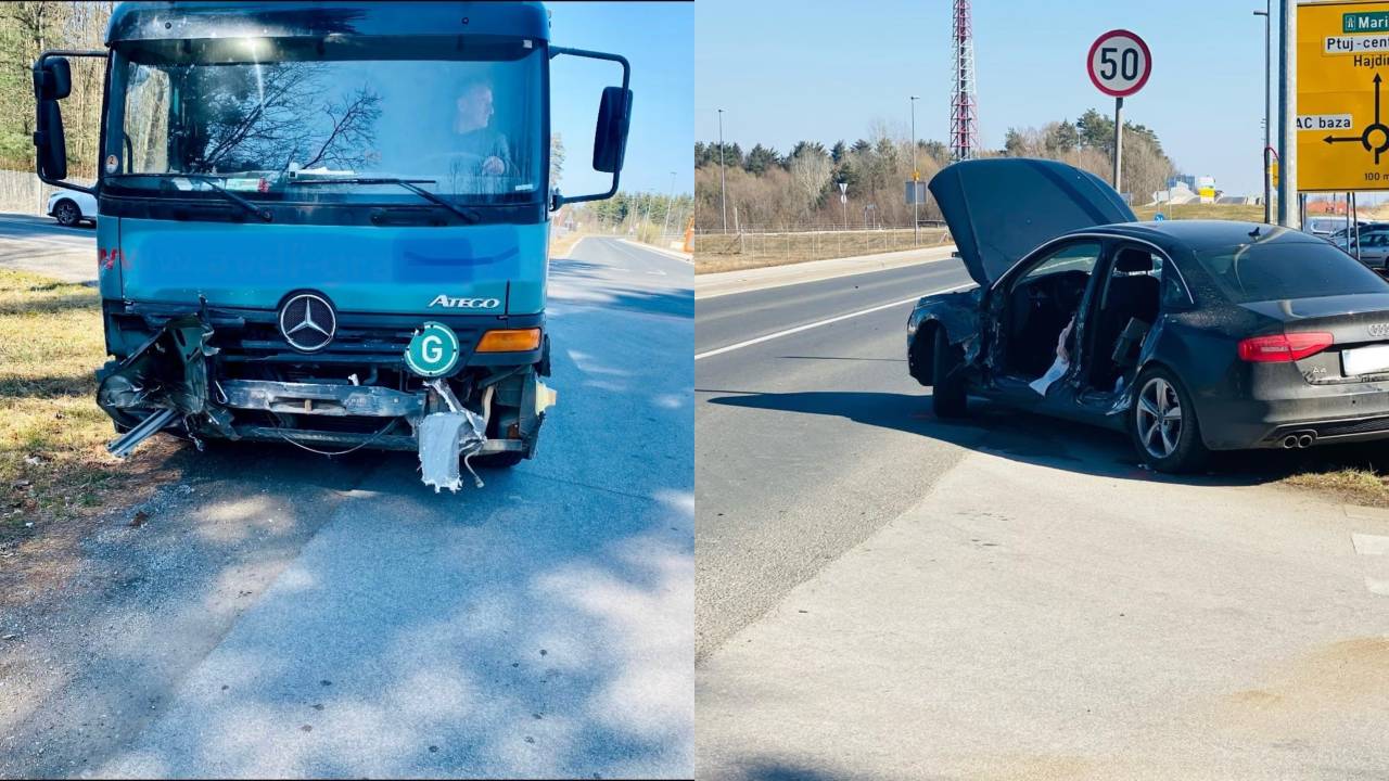 Po poročanju Uprave za zaščito in reševanje Republike Slovenije sta ob 12.16 v naselju Zgornja Hajdina, občina Hajdina, trčili osebno in tovorno vozilo.