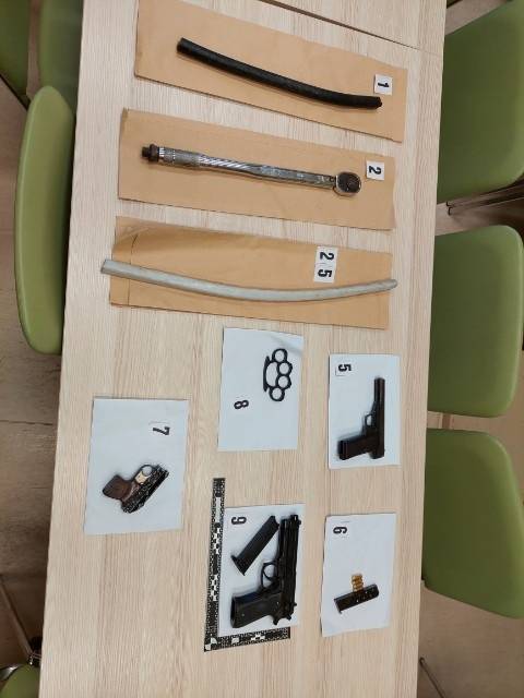 Zasegli so več palic za napad, bokser, pištoli z naboji ter več električnih vodnikov, za katere obstaja sum, da so bili pridobljeni s kaznivim dejanjem.