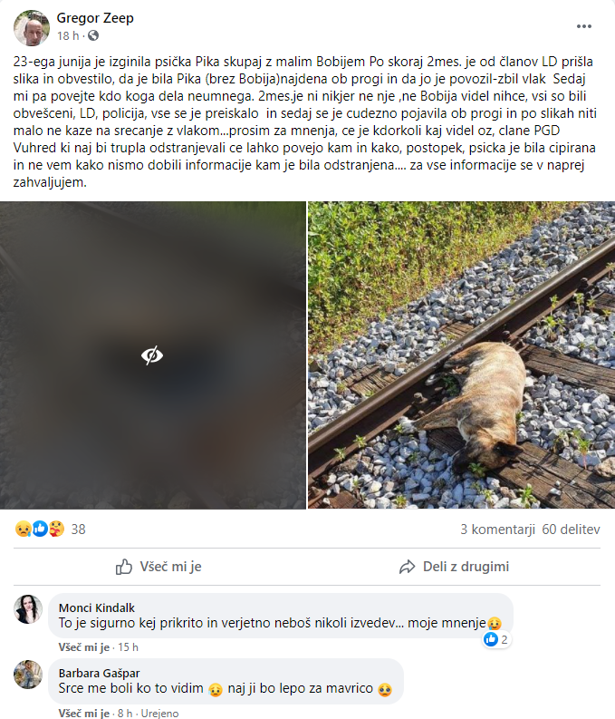»Sedaj mi pa povejte, kdo koga dela neumnega. Dva meseca ne nje ne Bobija ni videl nihče. Vsi so bili obveščeni, lovsko društvo, policija. Vse se je preiskalo in sedaj se je čudežno pojavila ob progi in po slikah niti malo ne kaže na srečanje z vlakom,« je ob objavi mrtvega psa zapisal lastnik.