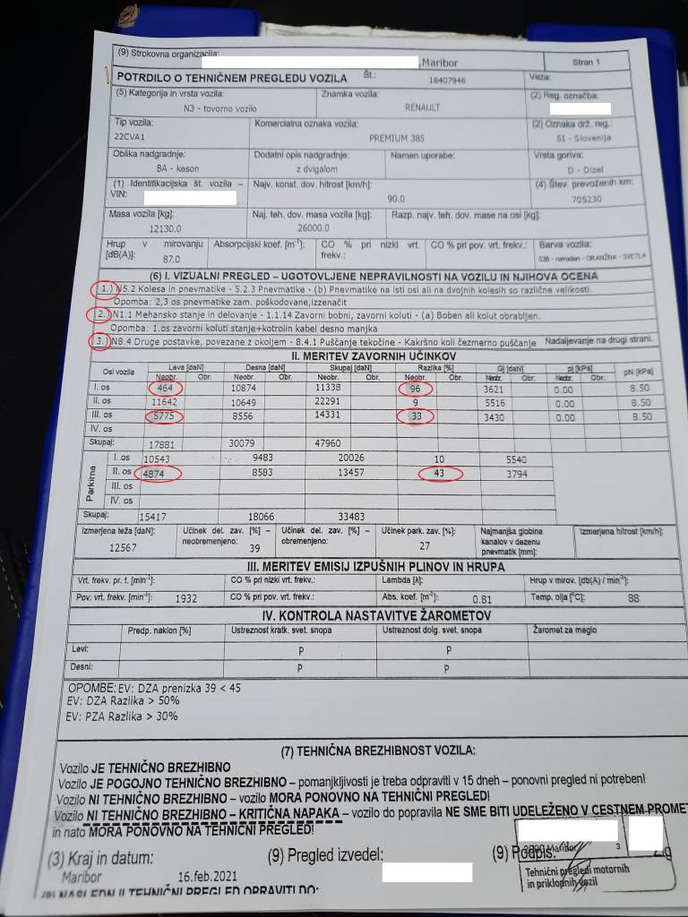 Pri tehničnem pregledu je bilo ugotovljeno, da zavore na levi strani vozila ne delujejo brezhibno, saj je bila razlika v zavornem učinku z desnim kolesom na prvi osi kar 96 odstotkov, vozilo pa je imelo neizpravne kar tri pnevmatike na vozilu, so sporočili iz Policijske uprave Maribor.