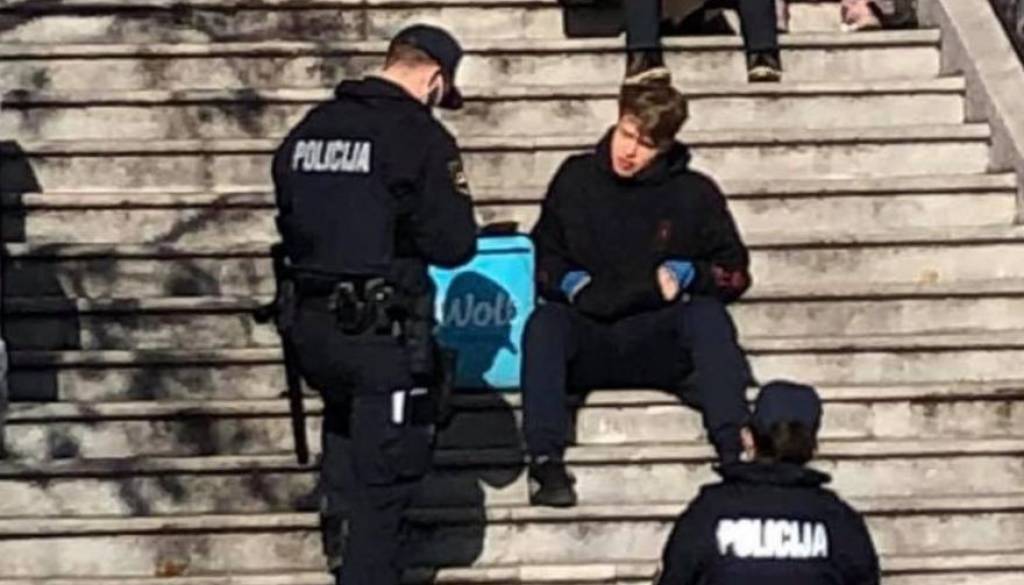 Fotografija fanta - dostavljalca hrane, ki sedi na stopnicah cerkve Marijinega oznanjenja na Prešernovem trgu v Ljubljani, ob njem pa policista, ki mu pišeta kazen, je zaokrožila po družbenih omrežjih in sprožila val ogorčenja in obsojanja.