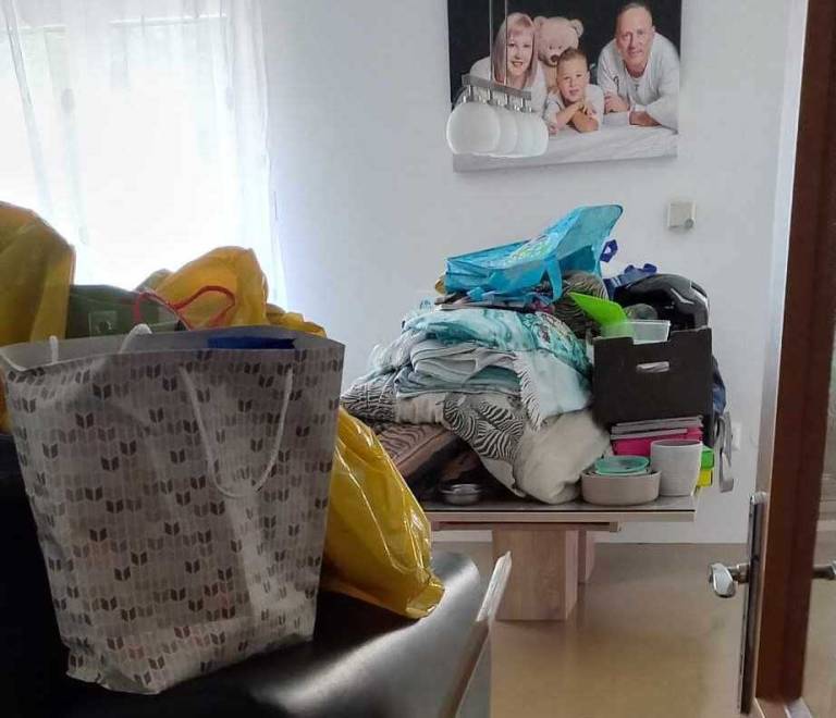 V dveh garažah so polne vrečke, ki jih družina mora pregledati, da bi ugotovili, kaj je še mogoče rešiti. Valerijin sin se pripravlja na vstop v četrti razred, a so spomini na sobico, risbice, spričevala in priznanja izginili.