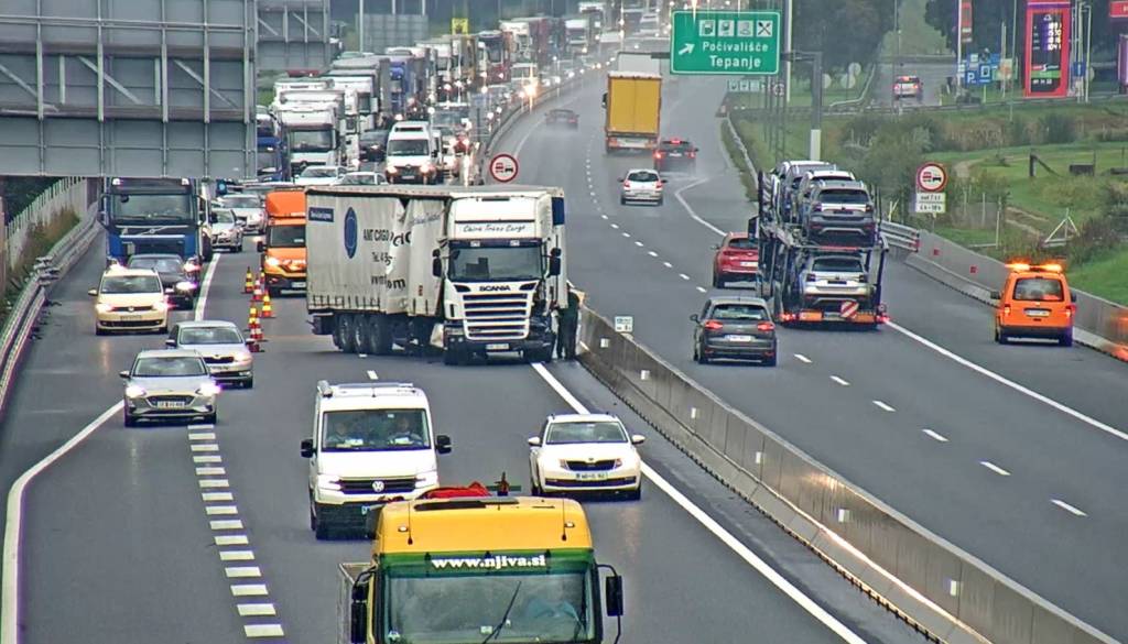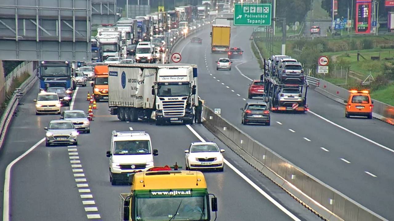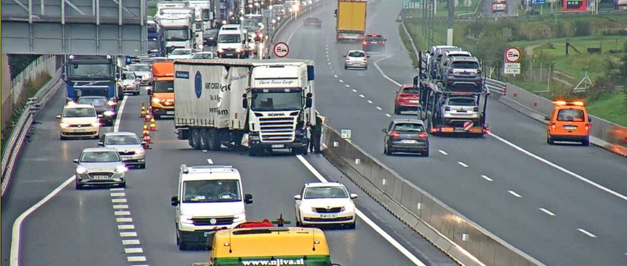 Na štajerski avtocesti sta zaradi prometne nesreče zaprta vozni in prehitevalni pas pred priključkom Slovenske Konjice proti Ljubljani. Promet poteka po odstavnem pasu.