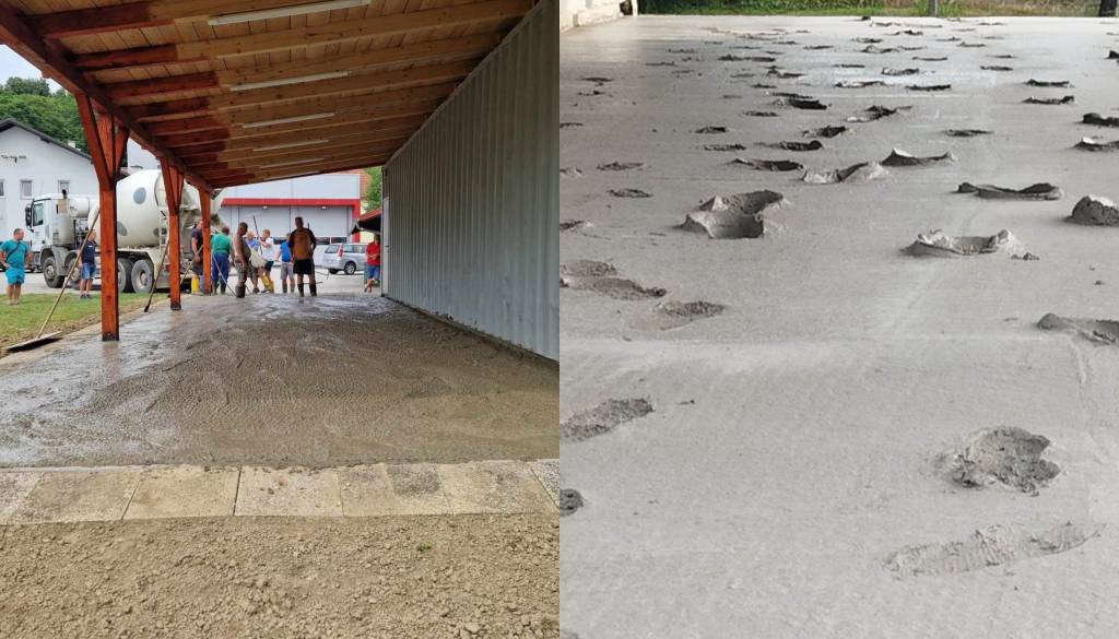 Gasilci iz Dvorjan so na družbenih omrežjih delili fotografijo opravljenega dela – betonirali so tla. Zraven pa še eno, ki razkriva, da se je po še svežem betonu nekdo sprehodil in pustil ogromne luknje.