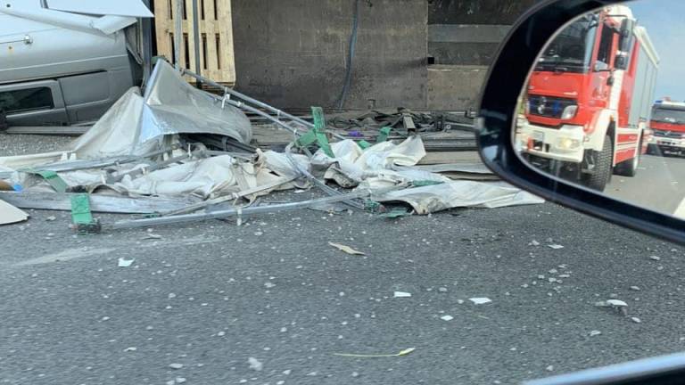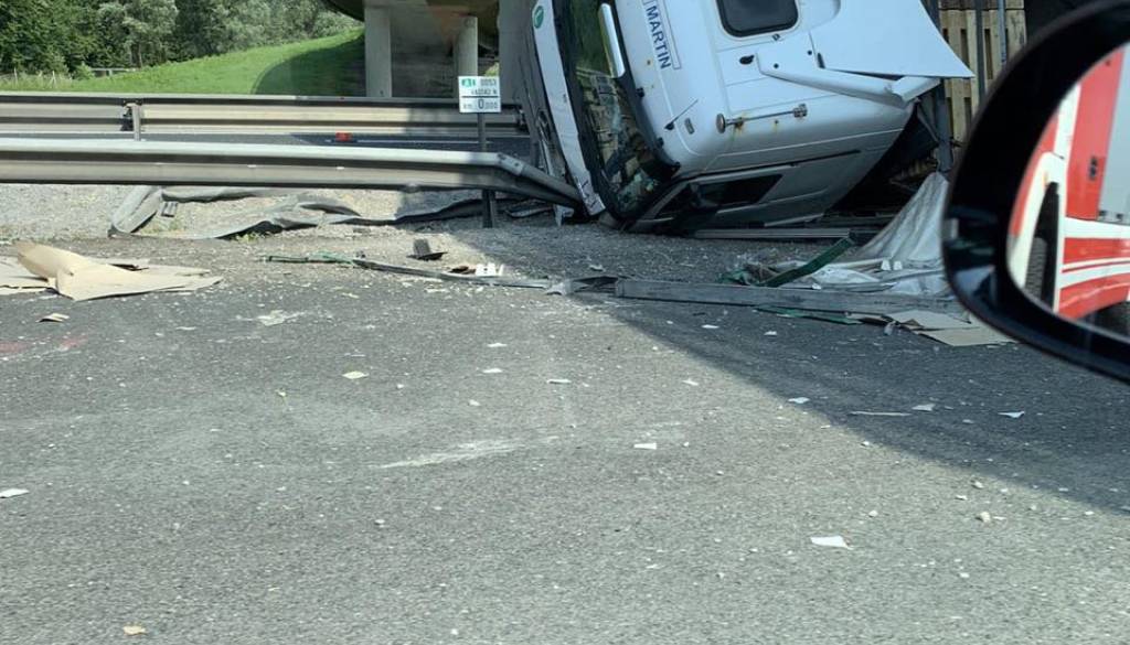 Po poročanju Uprave Republike Slovenije za zaščito in reševanje se je ob tem odpel natovorjen kolut pločevine, ki se je skotalil po cestišču in poškodoval dve osebni vozili.