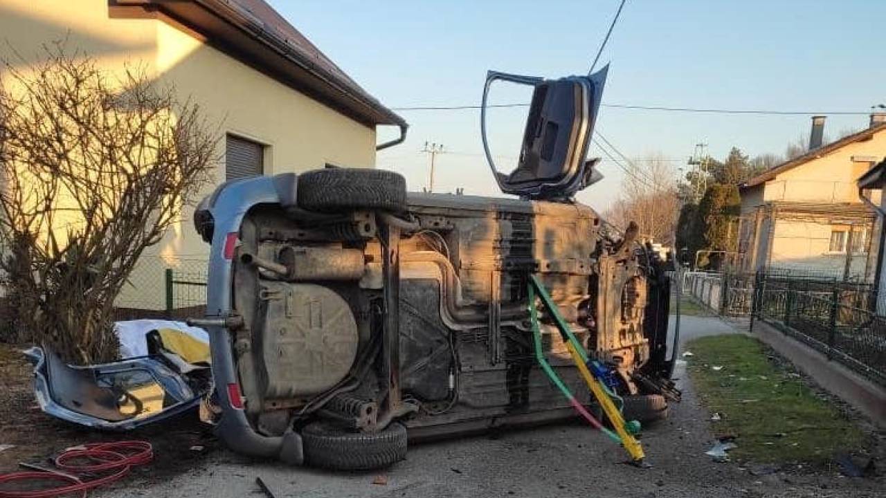 Voznik osebnega avtomobila, ki je bil v vozilu sam, je trčil v drog električne napeljave, kjer je vozilo obstalo na boku.