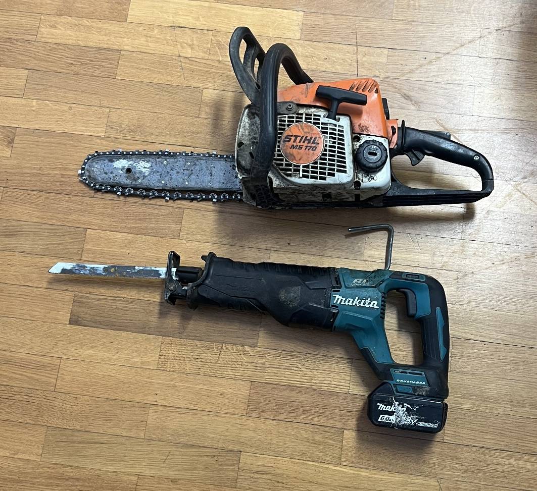 Med preiskavo so odkrili dve registrski tablici, motorno žago Stihl in baterijski rezalnik znake Makita, ki jim lastniki niso znali pojasniti izvora. Vse so zasegli.