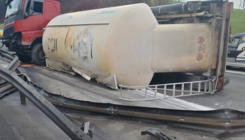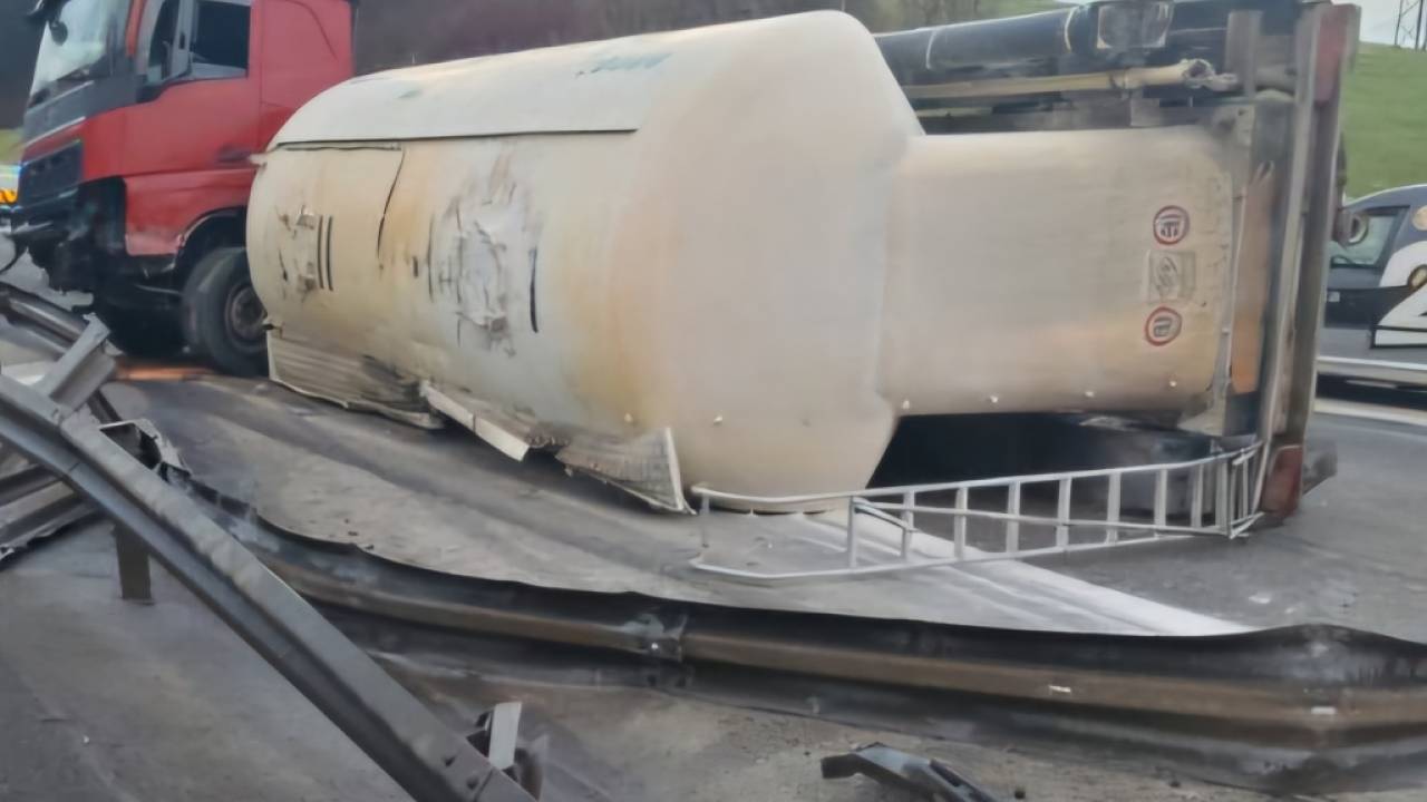 Do prometne nesreče je prišlo, ker je voznik zaradi uporabe telefona zapeljal v levo in trčil v odbojno ograjo, pri čemer se je cisterna, ki jo je prevažal, prevrnila, so pojasnili policisti.