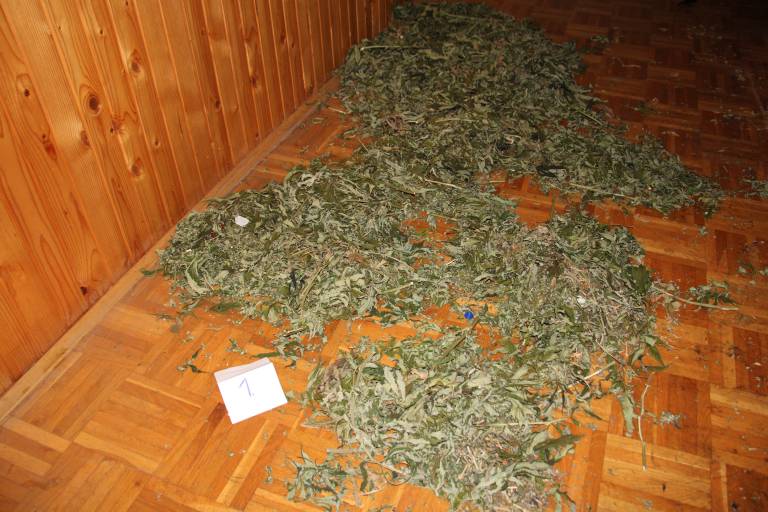 V poslopju so odkrili približno dva kilograma posušenih rastlinskih delcev rjavo zelene barve, za katere sumijo, da so delci prepovedane droge konoplje, tehtnico in električni mešalnik.