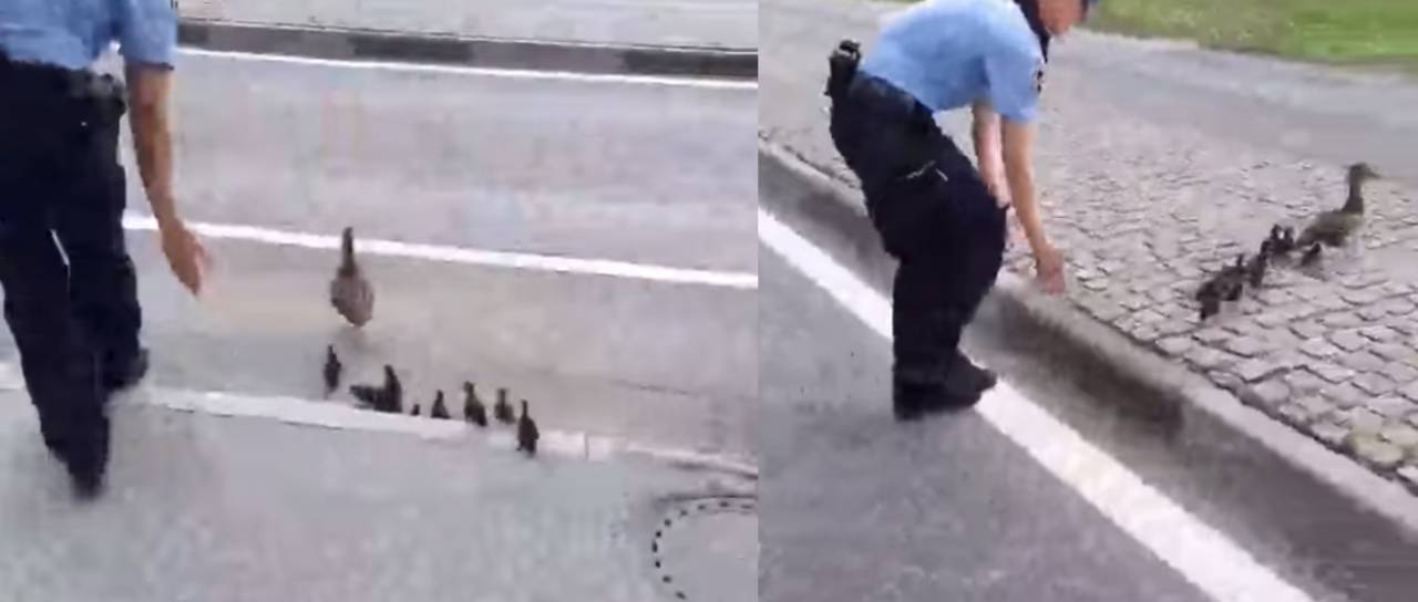 Policisti so ustavili promet in račji družini pomagali, da se je varno vrnila v potok, kjer domujejo.