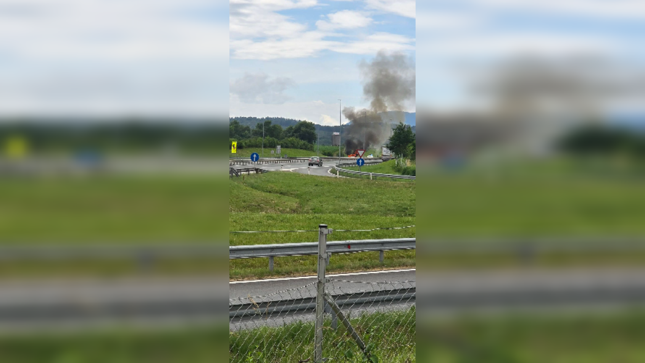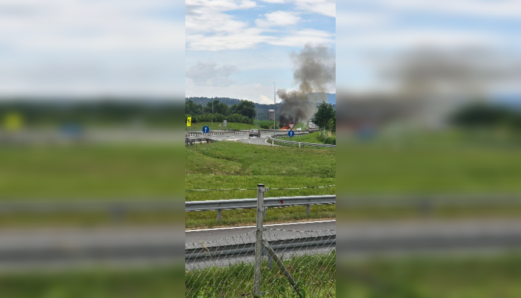 Na prizorišču so gasilci in policisti, iz vozila pa se vali gost dim, kar je razvidno tudi s fotografij s kraja dogodka.