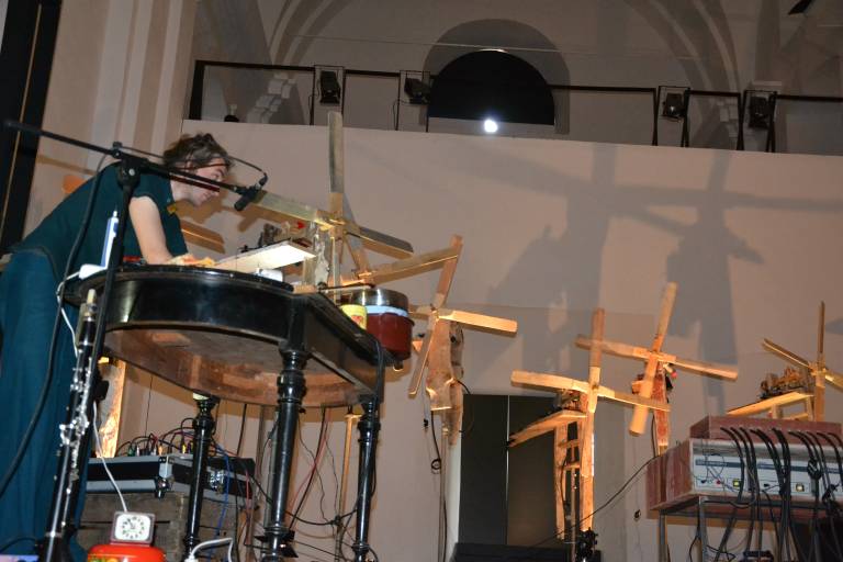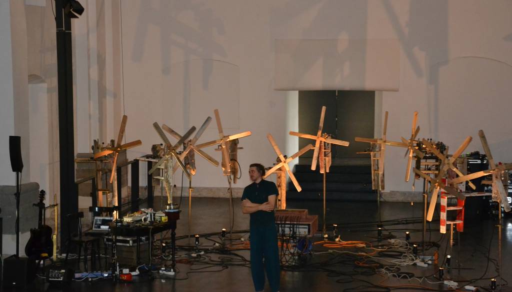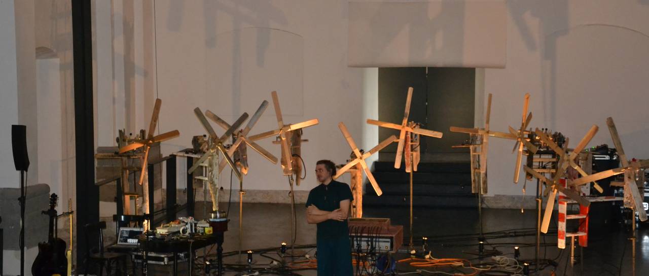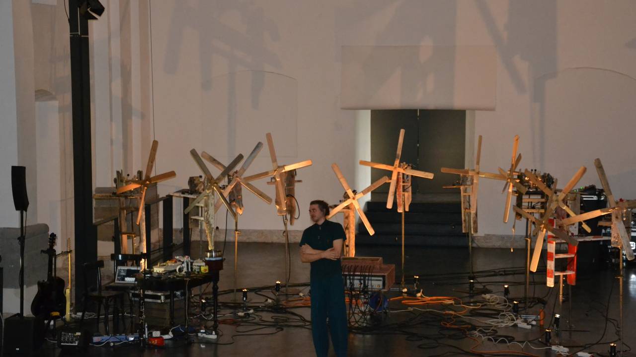 Kmalu je izdelal tudi svoje klopotce. Tem smo jim bili na otvoritvi priča, saj je umetnik postregel z zvočno inštalacijo, poimenovano kar Klopotec Orkestra, ki je vključeval klopotce, kitaro, stroje ter tolkala. Umetnik je veliko dvorano Dominikanskega samostana preplavil z zvokom teh znanilcev jeseni.