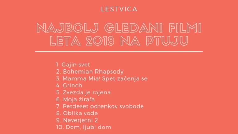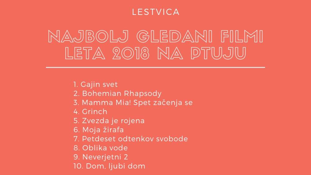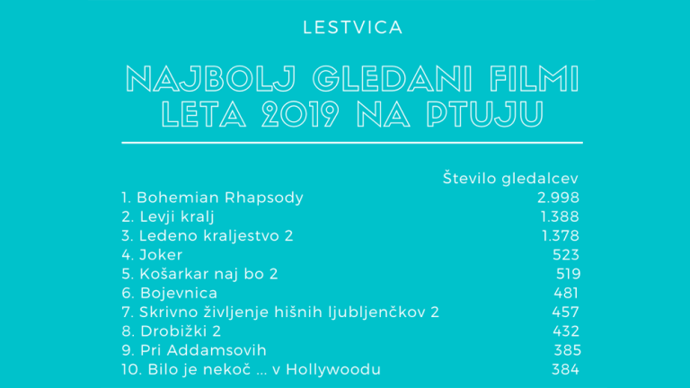 Na prvem mestu ptujske lestvice gledanosti v preteklem letu na prvem mestu kraljuje glasbena biografska drama Bohemian Rhapsody, predvsem po zaslugi množično obiskane projekcije v letnem kinu na Panorami. Omenjeni film se je leto poprej uvrstil na drugo mesto lestvice.