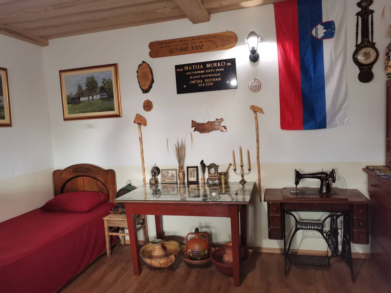 Prava zakladnica predmetov pa se razkrije ob vstopu v spominsko sobo. Od postelje, komode, Singer šivalnega stroja, celo pisalnega stroja iz Murkovega obdobja, posod, celo kurentove maske. Za masko pove, da ta pač v Murkovem muzeju ne sme manjkati, je prevelik del tradicije.