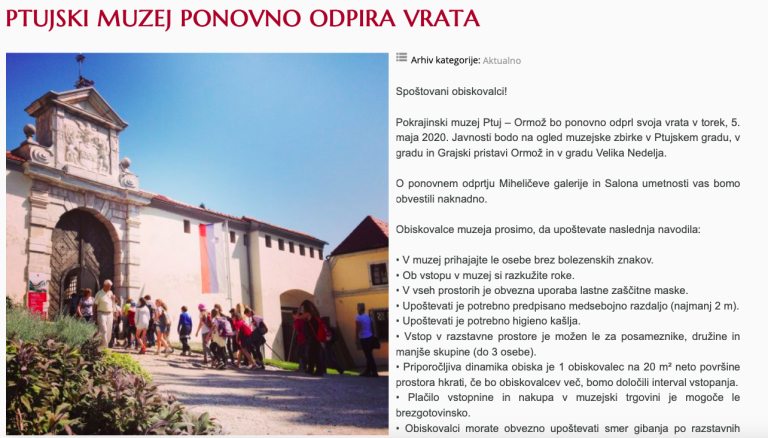 Na ministrstvu pa so po poročanju STA v omenjenih smernicah še zapisali, da podpirajo čimprejšnje, vendar premišljeno odpiranje javnih zavodov ter da naj njihovo odprtje naj vodstva izvedejo najkasneje do 18. maja, ko obeležujemo Mednarodni muzejski dan.