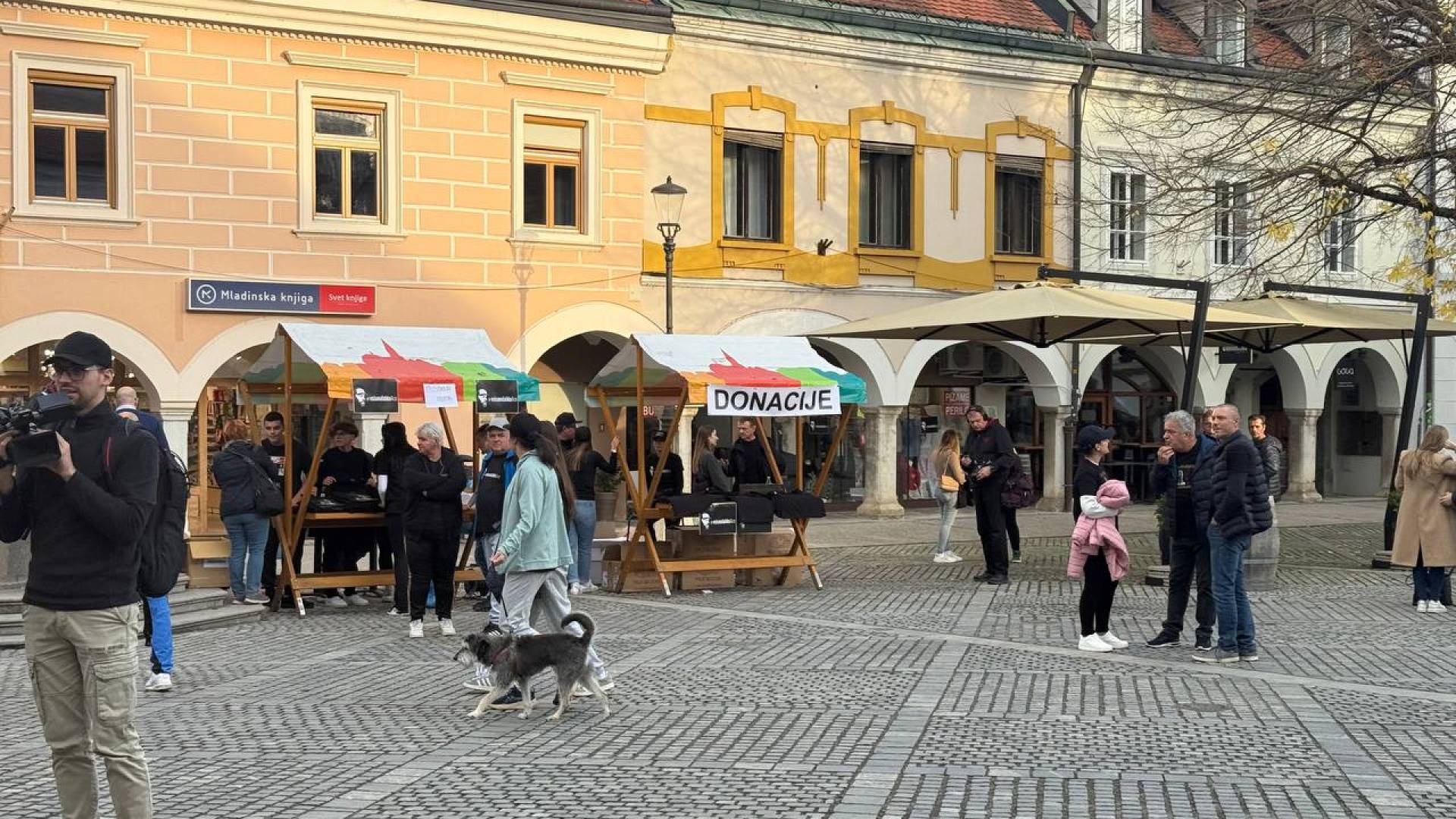 16.03 Na stojnicah ponujajo majice in šilt kape #vsismolahkoaco ter zbirajo prostovoljne prispevke oziroma donacije za družino pokojnega. Protestniki, ki se zbirajo, nosijo majice Acotu v čast z napisom Vsi smo lahko Aco.