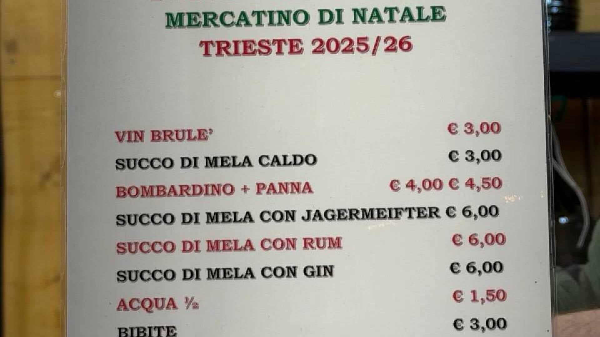 Nekatere od stojnic ponujajo še značilne zimske pijače, ki pri nas niso tako prisotne: vin brulé po tri evre, topel jabolčni sok po tri evre, priljubljeni bombardino s smetano med štiri in 4,50 evra, ter močnejše verzije z žgano pijačo – jabolčni sok z Jägermeistrom, rumom ali ginom – vse po šest evrov. Voda stane 1,50 evra, ostale brezalkoholne pijače okoli tri evre.