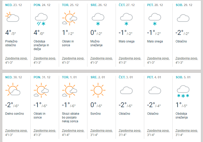 Na predbožični večer, 24. decembra, bi lahko na Ptuju tudi snežilo. Temperature naj bi se gibale med -2 in 1 stopinjami. Na božično jutro naj bi na Ptuju namerili -2 stopinj, čez dan pa naj bi se temperature povzpeli stopinjo nad ničlo. Skozi oblake naj bi posijalo nekaj sonca.
