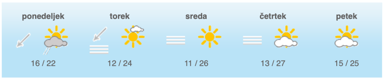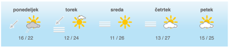 Najnižje jutranje temperature bodo od 9 do 13, na Primorskem okoli 17, najvišje dnevne od 22 do 26, na Primorskem do 28 stopinj Celzija, napovedujejo državni meteorologi.