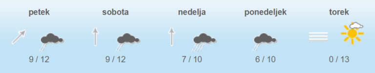 Vremenoslovci agencije za okolje napovedujejo, da bo jutri oblačno z občasnim dežjem, več padavin bo na zahodu, na severovzhodu bo večji del dneva še suho. Padavine se bodo zvečer razširile nad vso Slovenijo.