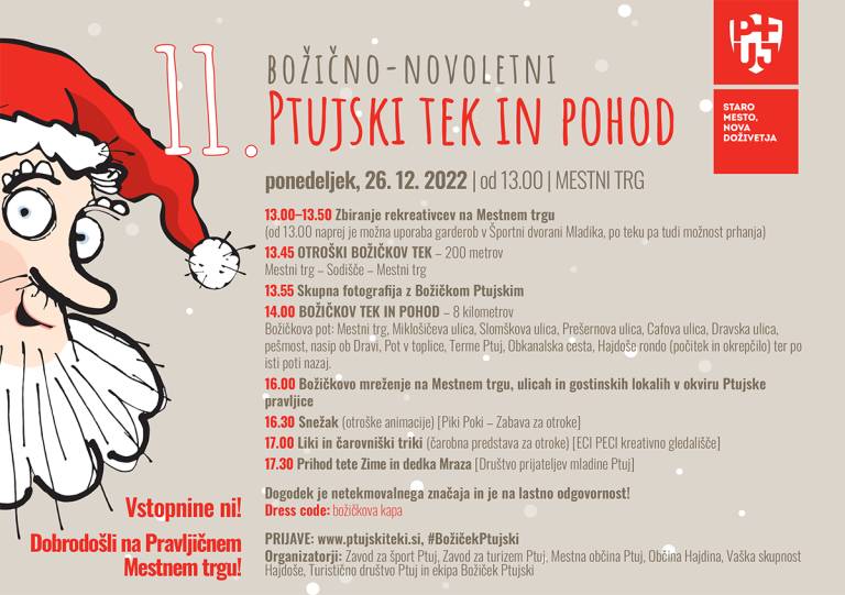 Božiček Ptujski se bo letos znova podal po ptujskih ulicah. Pridružite se mu lahko na že enajstem božično-novoletnem teku in pohodu. V času izvedbe dogodka bodo delne zapore ceste.