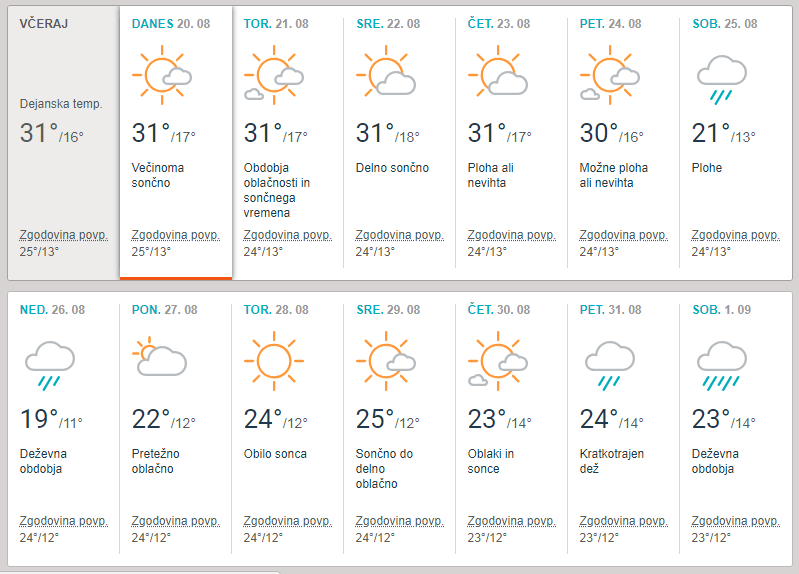 AccuWeather tudi za ves prihodnji teden napoveduje precej nižje temperature in sicer med 19 in največ 25 stopnij Celzija. Čaka nas velika temperaturna razlika in vse kaže na to, da se bomo za letos poslovili od visokih temperatur, ki segajo čez 30 stopinj.