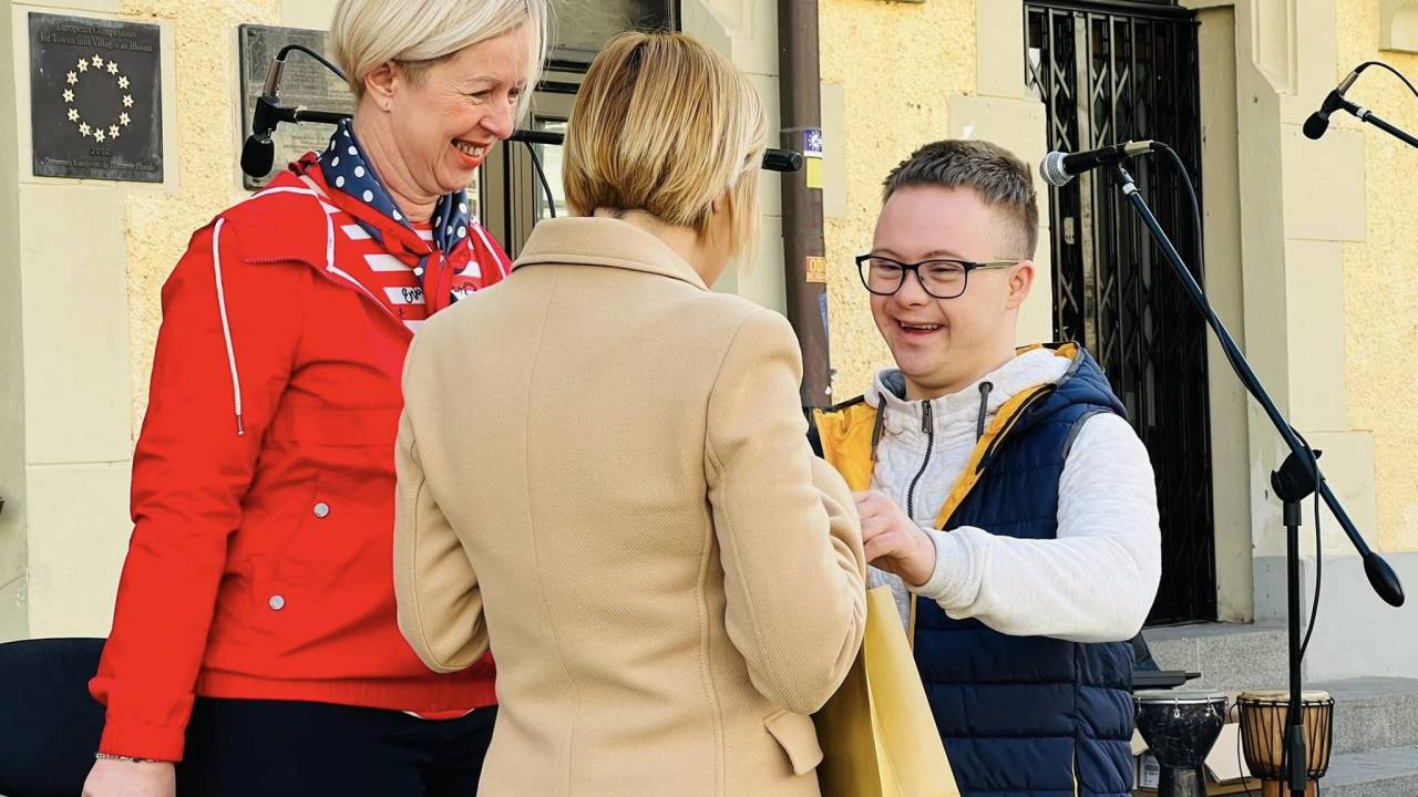 Učenci Osnovne šole dr. Ljudevita Pivka, Društvi Sonček in Sožitje ter ostala društva, ki delujejo v Svetu za invalide Mestne občine Ptuj so pred mestno hišo nagovorili županjo.