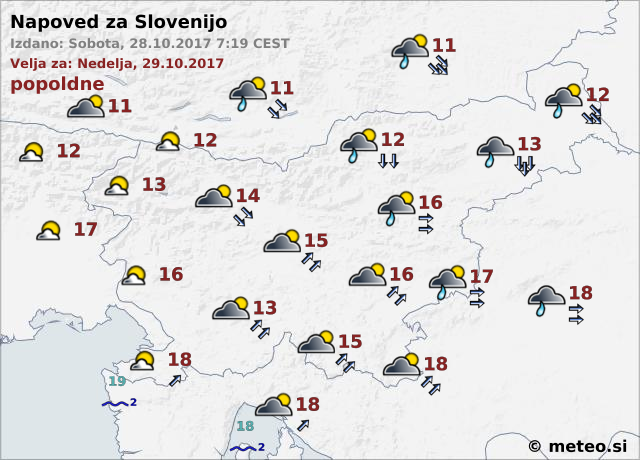 Nedelja bo vetroven dan. Dopoldne in sredi dneva bo v notranjosti Slovenije pihal okrepljen jugozahodni veter, popoldne pa se bo obračal na severno do severozahodno smer. Predvsem na Štajerskem in v Pomurju bodo najmočnejši sunki ponekod lahko presegli hitrost 70 km na uro.