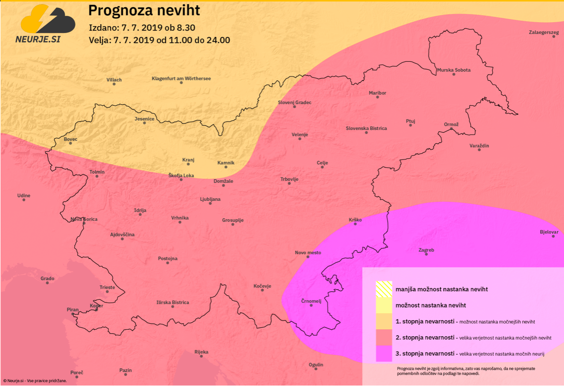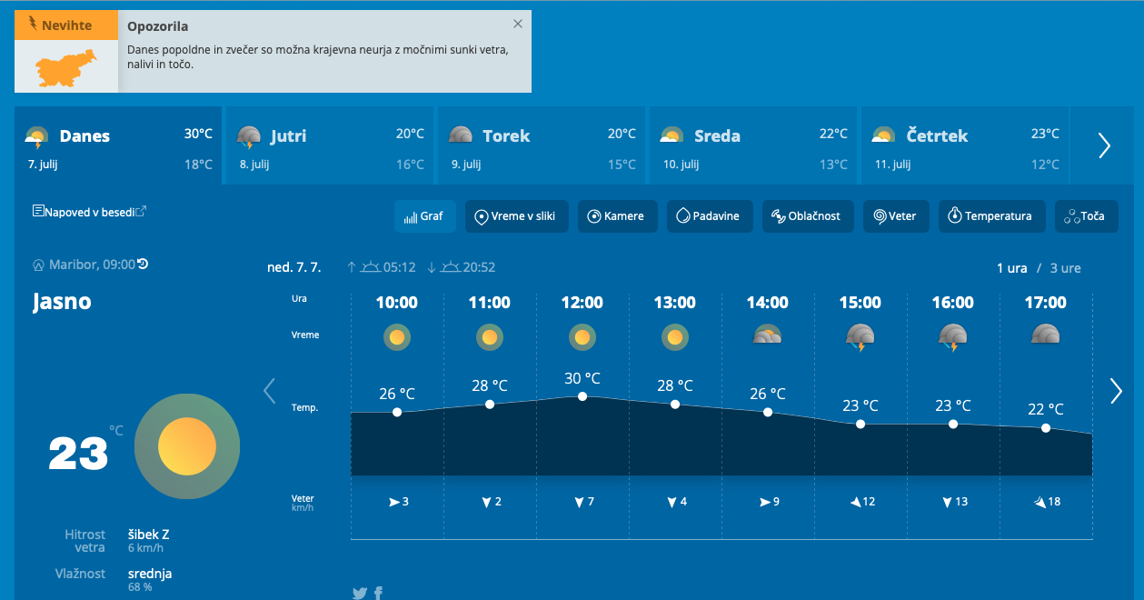 Dopoldan bo nad Slovenijo še delno jasno, le občasno ponekod pretežno oblačno. Tekom dneva se bodo začele predvsem v južni polovici države pojavljati posamezne predfrontalne plohe in nevihte, ki bodo lahko tudi močnejše. Ob nevihtah so možni močnejši nalivi, sunki vetra in toča, ki je lahko sprva tudi debelejša, poročajo na Neurje.si.